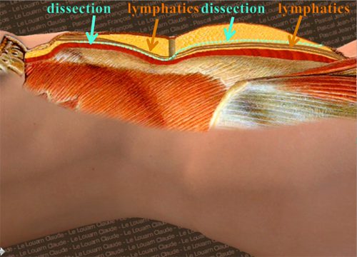 Après l’incision correspondant à la future cicatrice, la dissection va d’abord s’effectuer en surface pour protéger les troncs lymphatiques profonds, puis changer de plan au niveau de l’ombilic (là ou se trouvent seulement de fines ramifications lymphatiques) et remonter vers le sillon sous mammaire en profondeur au ras de l’aponévrose musculaire (donc en dessous des troncs lymphatiques du haut du ventre).